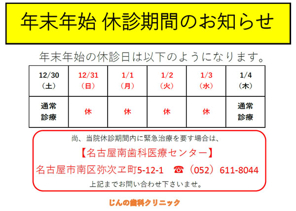こんにちは 年末年始の休診のお知らせです。