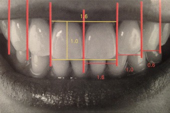「中切歯(1.618)」:「側切歯(1)」:「犬歯(0.618)」の配列にすることで前歯の審美性が向上します。