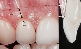 歯だけをキレイにしても美しい口元を実現できません。口元の一部である「歯茎」を含めた設計が重要です。当院では、歯茎の生物学的幅径のルールを理解した、歯茎と調和した被せ物を製作します。