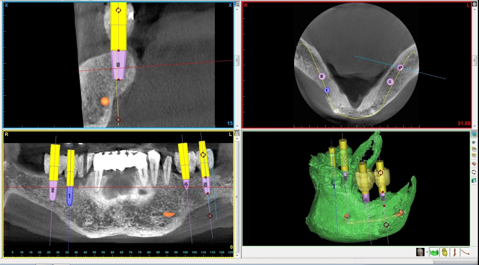 しかし、この治療法は正確性や安全性に欠け、患者さんへのリスクも高いです。一方で、シミュレーションでは神経や血管などの危険な部分を確認しながら、インプラントを入れる位置やサイズを決めていきます。
