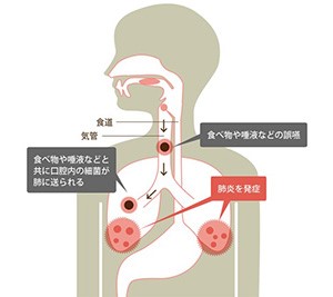 若い人や健康な方であれば、誤嚥はただ「むせる」だけで終わりです。しかし病気の方、高齢者では、飲食物と一緒に口内細菌が肺へ入り誤嚥性肺炎を発症してしまう場合があります。高齢者ほど誤嚥が発生しやすく、さらに、免疫機能が低下している高齢者では誤嚥性肺炎になってしまうリスクが大きくなっています。